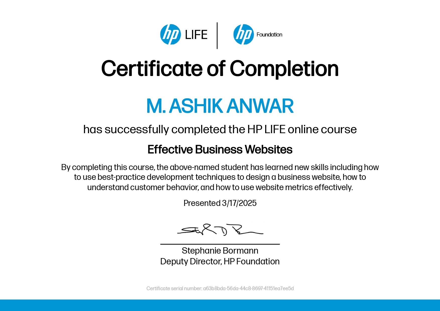 Business-Driven Design (HP LIFE): Certified in "Effective Business Websites," demonstrating proficiency in best-practice development techniques, effective use of website metrics, and a strong understanding of customer behavior to ensure designs meet core business objectives and drive measurable results.